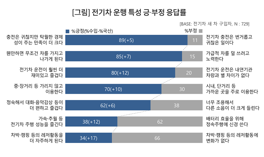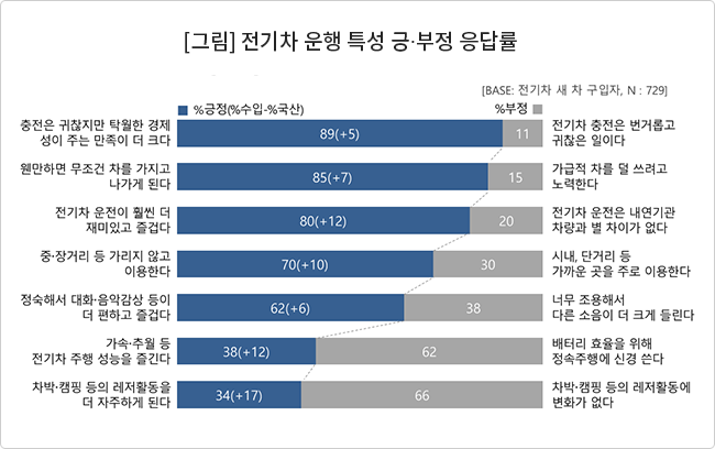 수입차는 이밖에도 운행 거리(+10%p), 이용 빈도(+7%p), 소음 인식(+6%p), 충전vs경제성(+5%p) 등 모든 비교항목에서 국산보다 긍정 비율이 높았다. 수입 전기차 이용자들이 차의 특성을 더 적극적으로 활용면서 즐기고 있는 것이다.