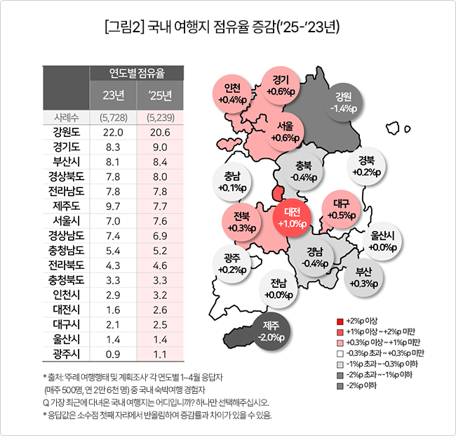 ○ 여행지역도 짧은 일정에 맞춰 접근성 좋은 곳으로 몰렸다. 여행 소비자 밀집지역인 서울·경기·인천 등 수도권의 여행지 점유율은 ’23년 대비 각각 +0.6%p, +0.6%p, +0.4%p 증가했다[그림2]. 근거리 단기간 경향에 맞춘 역내 여행이 증가했기 때문이다. 대전은 +1.0%p로 상승 폭이 가장 컸다. 이들 지역은 인구 밀집지(수도권)에서 가깝고 교통이 편리한 대표적인 근거리 여행지로, 주말이나 짧은 휴가에 다녀오기 적합하다는 점 특징이 있다. 특히 ‘노잼도시’로 불렸던 대전은 야구의 인기 증가와 함께 MZ세대 취향에 맞는 맛집, 레트로 감성 거리 등이 알려지며 가장 큰 증가세를 보였다.