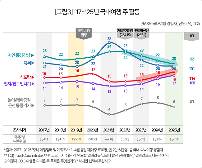 ‘자연풍경 감상’ 줄고, ‘식도락’과 ‘친지·친구 만나기’ 늘어
