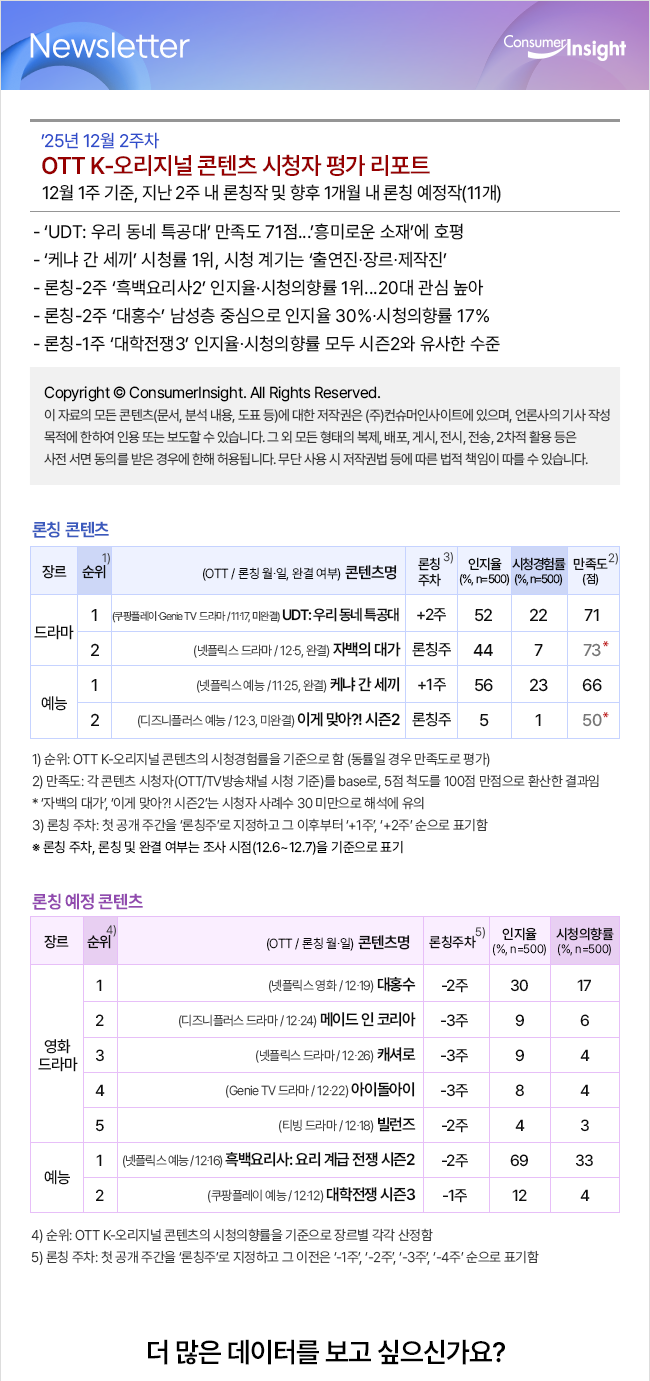 ’25년 12월 2주차 OTT K-오리지널 콘텐츠 시청자 평가 리포트 2025-12-11 OTT K-콘텐츠 시청자 평가 결과와 관련하여 보다 자세한 내용을 원하시면 아래 연락처로 문의해 주십시오. 박경희 본부장 parkkh@consumerinsight.kr 02-6004-7619 박지영 팀장 parkjy@consumerinsight.kr 02-6004-7629 전유진 대리 jeonyj@consumerinsight.kr 02-6004-7656 양수정 연구원 yangsj@consumerinsight.kr 02-6004-7628 이전’25년 12월 3주차 OTT K-오리지널 콘텐츠 시청자 평...2025-12-18 다음’25년 11월 4주차 OTT K-오리지널 콘텐츠 시청자 평...2025-11-27 목록