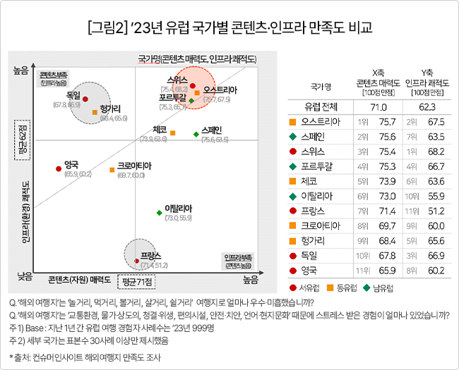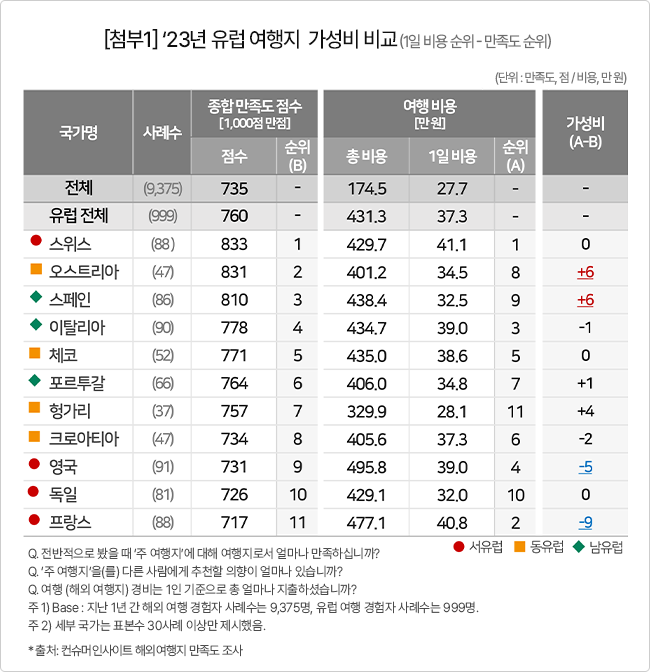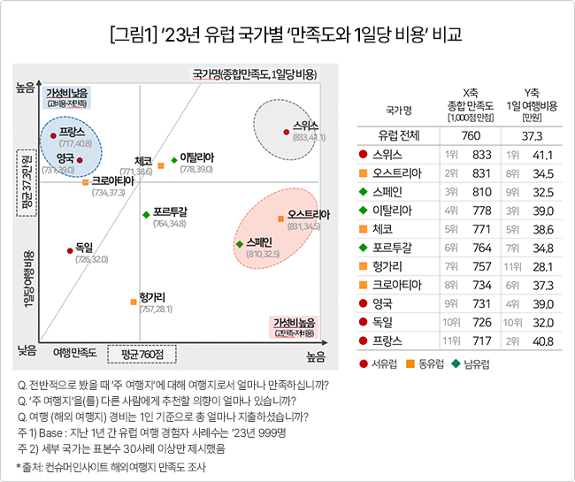 컨슈머인사이트, 유럽 국가별 만족도와 여행비 비교