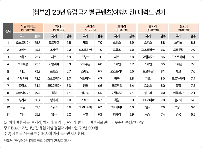여행 콘텐츠와 인프라 평가 : 스위스, 오스트리아, 포르투갈 순