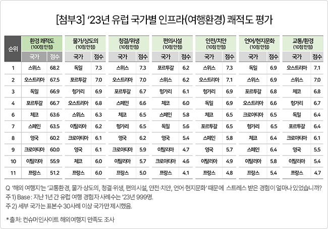 □ 비교 대상 국가는 응답자 사례수 30 이상인 11개국이었으며, 여러 나라를 여행했을 경우 가장 장기간 체류한 국가를 기준으로 평가했다. 비교 대상 11개국(사례수)은 영국(91), 이탈리아(90), 스위스(88), 프랑스(88), 스페인(86), 독일(81), 포르투갈(66), 체코(52), 오스트리아(47), 크로아티아(47), 헝가리(37)였다.