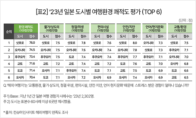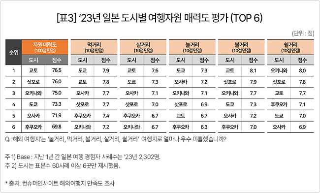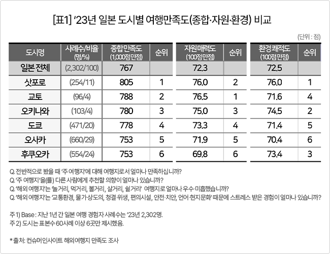 컨슈머인사이트, ’23년 일본 여행 지역별 만족도 비교